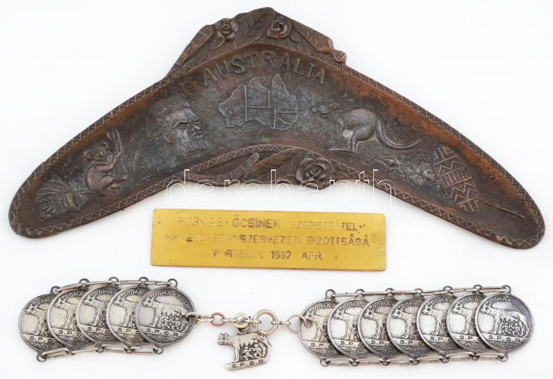 Beschreibung: Ausztrál emlékbumeráng, római emlékpénzek, kis emléktábla "Puskás Öcsinek szeretettel MH FJÜ Szakszervezeti Bizottsága 1992" felirattal