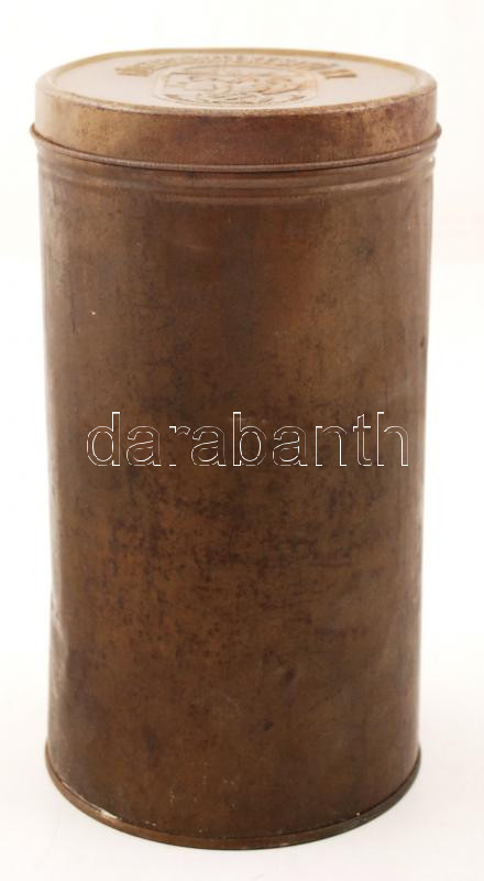 Beschreibung: "Fűszerértékesítő N.V., Minőséget a dolgozóknak" feliratú fém doboz, Rákosi-címerrel, m: 25 cm, d: 13,5 cm