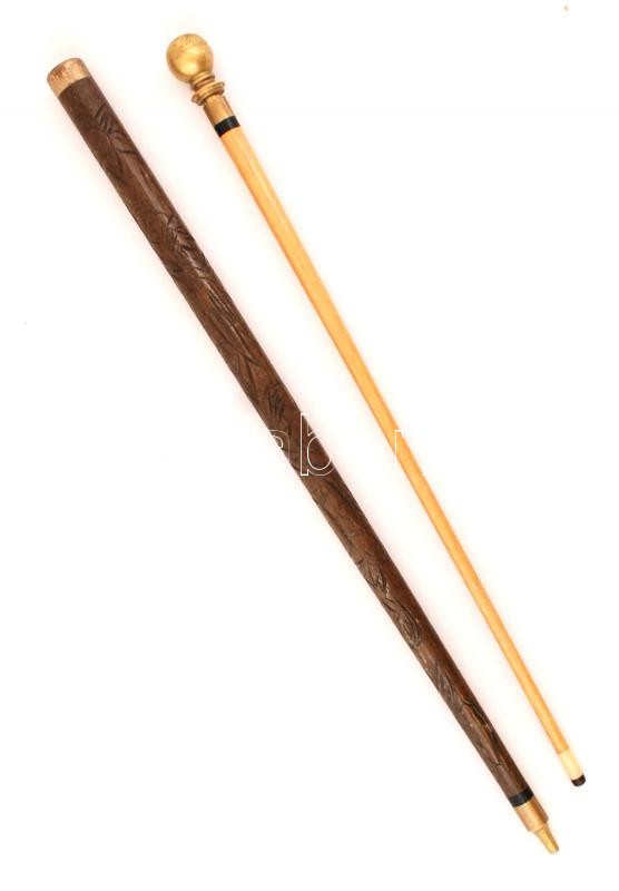 Beschreibung: Kettő az egyben sétabot, tetején réz gömbbel, faragott díszítéssel, jó állapotban, h: 84 cm