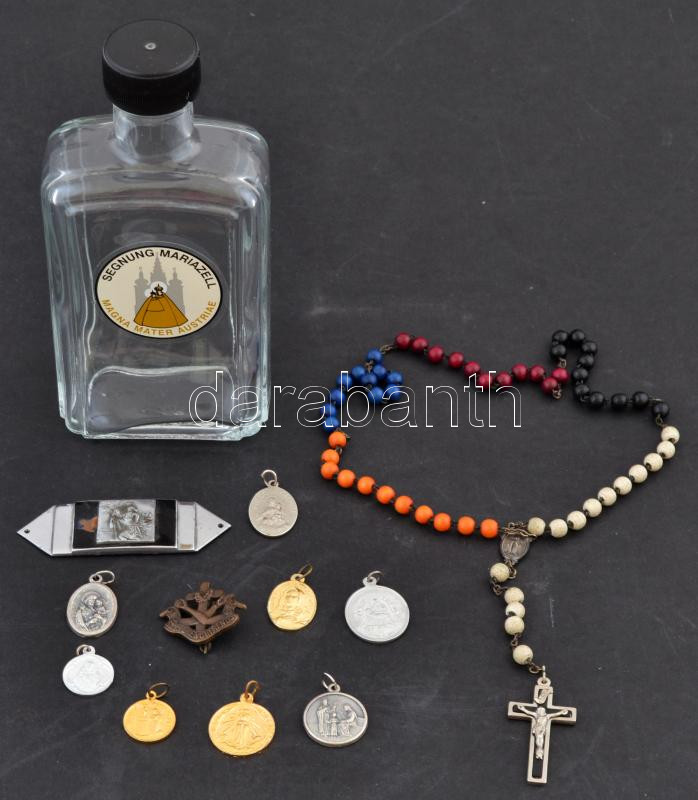 Beschreibung: Kis kegytárgy tétel medálokkal, rózsafüzérrel, szenteltvíztartó, stb.