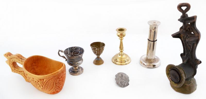 Beschreibung: Vegyes bolha tétel: kis fém kupica(2 db), hiányos mákdaráló, gyertyatartó, faragott fa kupa, stb.