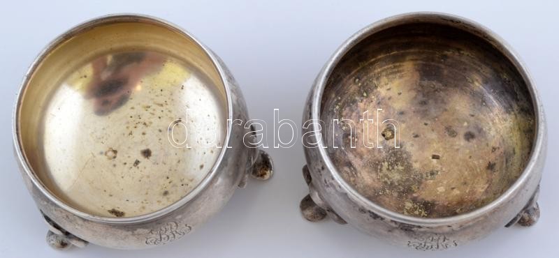 Beschreibung: 2 db ezüst (Ag.) monogramos fűszertartó, jelzettek, d: 4,5 cm, nettó 74 g