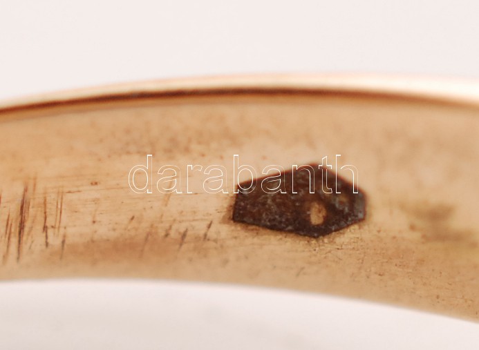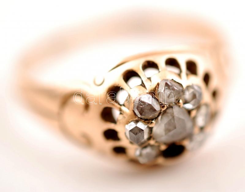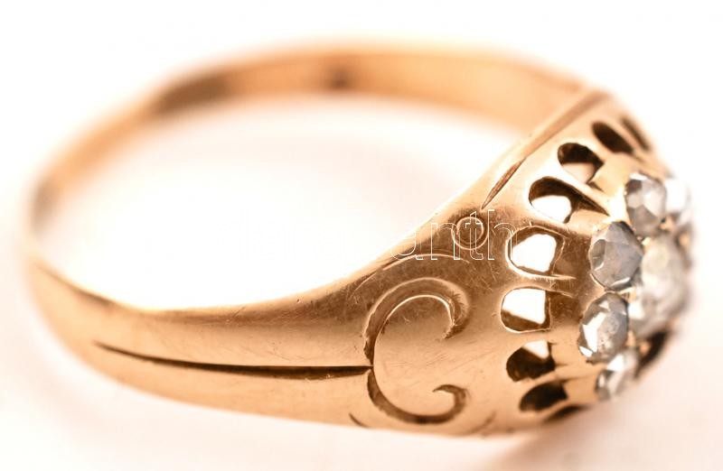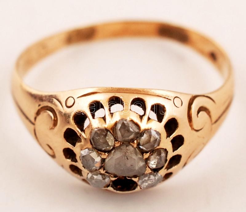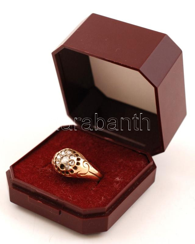 Beschreibung: Arany 14K (Au) fejes gyűrű, gyémántokkal (7db), egyik hiányzik, jelzett, méret:61, bruttó:4,2 g