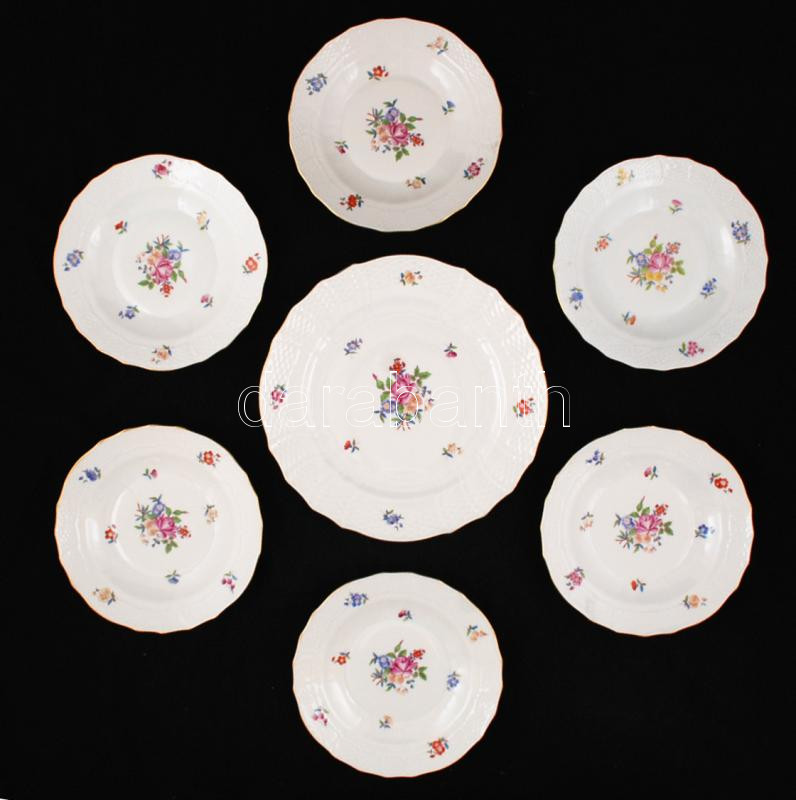 Beschreibung: Herendi virágmintás porcelán süteményes készlet, kézzel festett, egyiken hajszálrepedéssel, jelzett, 7 db