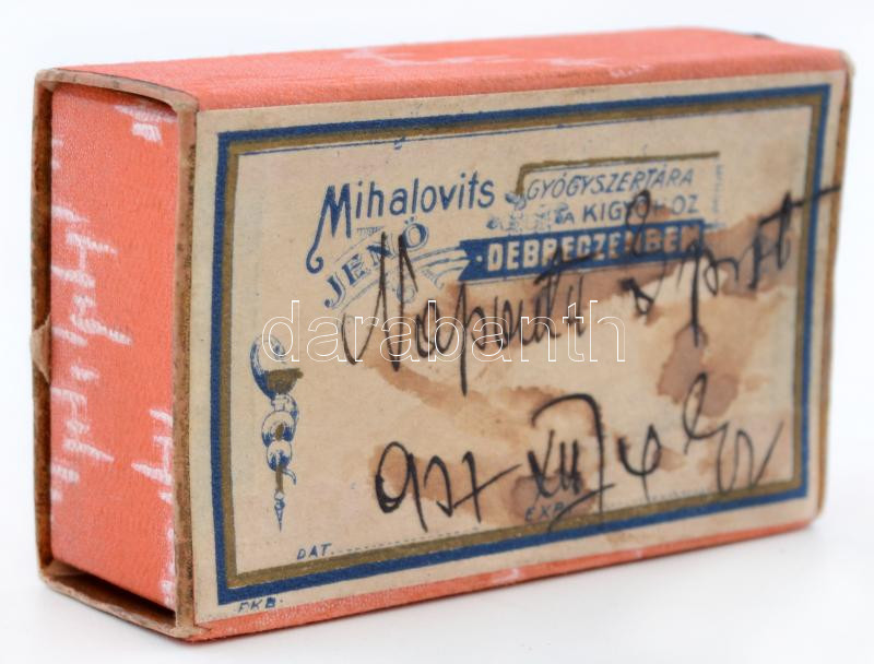 "Mihalovits Jenő Gyógyszertára a Kígyóhoz Debrecenben" papír gyógyszer... https://www.darabanth.com/de/255-Fernauktion/255.0/Andere-Sammelgebiete/Werbungen~600019/Mihalovits-Jeno-Gyogyszertara-a-Kigyohoz-Debrecenben-papir-gyogyszeres-dobozka~II1240806