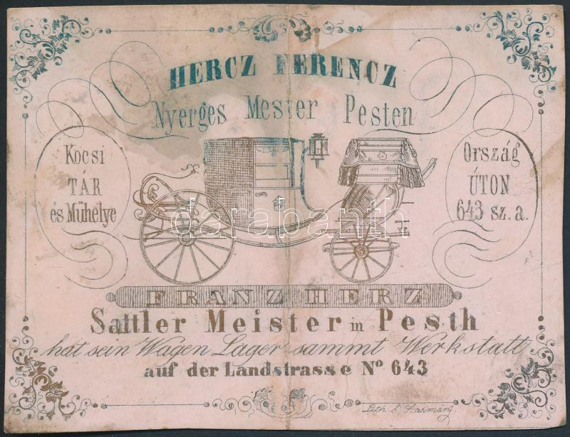 cca 1860? Hercz Ferencz nyerges mester Pesten, régi reklámkártya, folt... https://www.darabanth.com/de/255-Fernauktion/255.0/Andere-Sammelgebiete/Werbungen~600019/cca-1860-Hercz-Ferencz-nyerges-mester-Pesten-regi-reklamkartya-foltos-hatuljan-kezzel-irt~II1248624