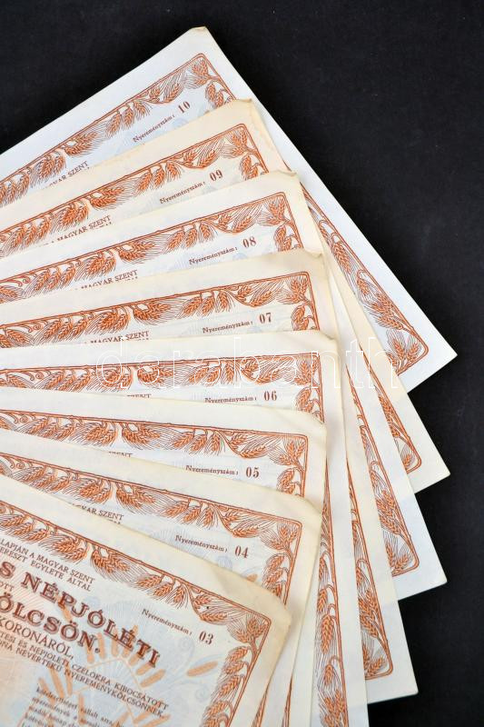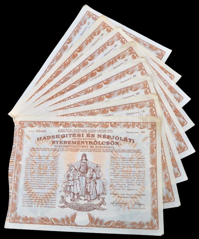 Beschreibung: Budapest 1917. "Hadsegítési és Népjóléti nyereménykölcsön" nyereménykötvények 40K-ról, szárazpecséttel (8x) sorszámkövetők T:II,II-