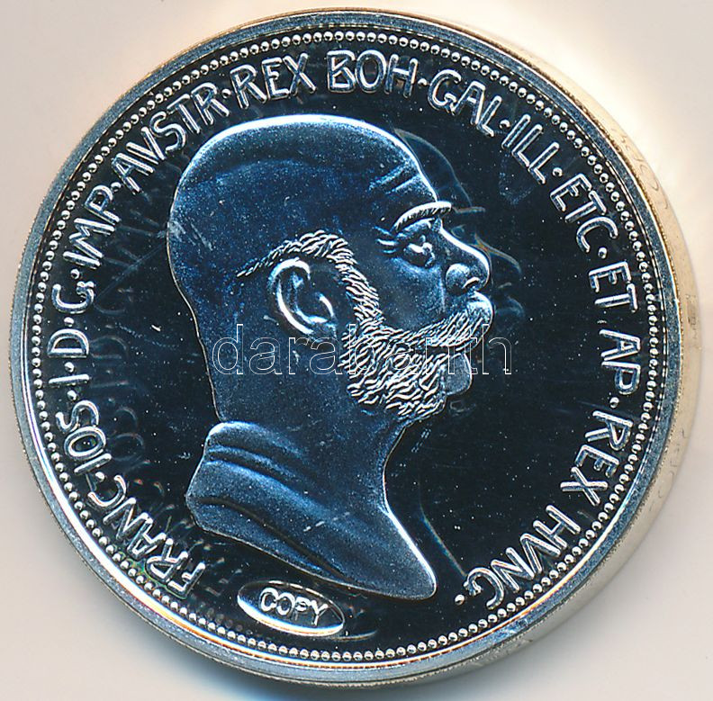 Beschreibung: DN "Osztrák-Magyar Monarchia pénzei utánveretben - 1908. 5 Corona" ezüstözött Cu-Ni emlékérem "COPY" beütéssel (32mm) T:PP
