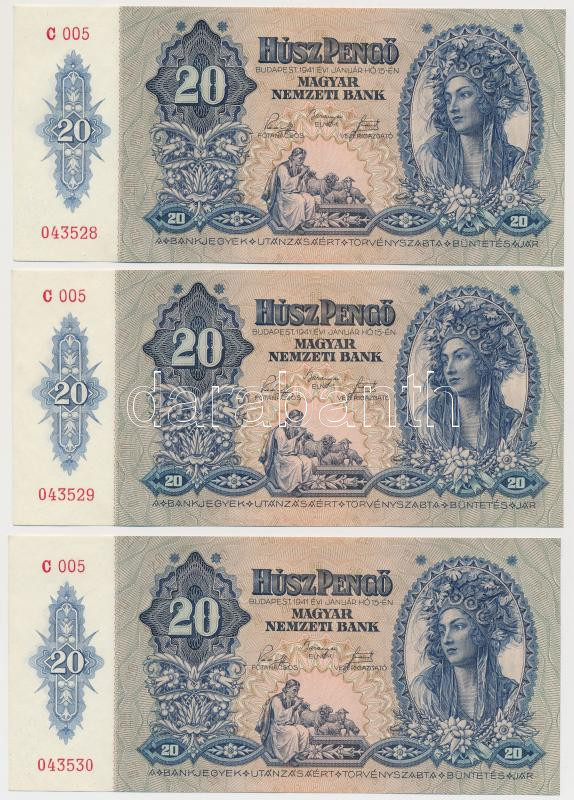 1941. 20P (3x) sorszámkövetők T:I https://www.darabanth.com/de/255-Fernauktion/255.0/Numismatik/Ungarische-Banknoten~9/1941-20P-3x-sorszamkovetok-TI~II1240546