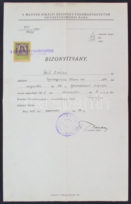 1926 Pécs, A Magyar Királyi Erzsébet-Tudományegyetem Orvostudományi Ka... https://www.darabanth.com/de/256-Fernauktion/256.0/Andere-Sammelgebiete/Dokument~15/1926-Pecs-A-Magyar-Kiralyi-Erzsebet-Tudomanyegyetem-Orvostudomanyi-Kara-altal-kiallitott-bi~II1253628