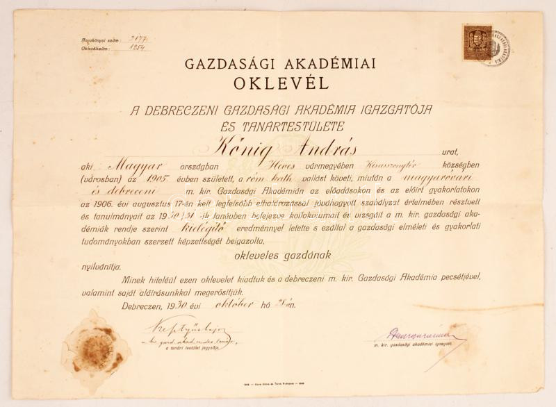 1930 Debrecen, A Gazdasági Akadémia által kiállított okleveles gazdána... https://www.darabanth.com/de/256-Fernauktion/256.0/Andere-Sammelgebiete/Dokument~15/1930-Debrecen-A-Gazdasagi-Akademia-altal-kiallitott-okleveles-gazdanak-minosito-oklevel-~II1256221