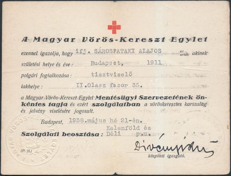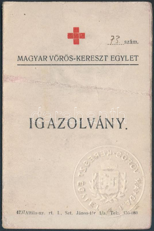 1938 Igazolvány, Magyar Vörös-Kereszt Egylet, 12x8cm https://www.darabanth.com/de/256-Fernauktion/256.0/Andere-Sammelgebiete/Dokument~15/1938-Igazolvany-Magyar-Voros-Kereszt-Egylet-12x8cm~II1257816