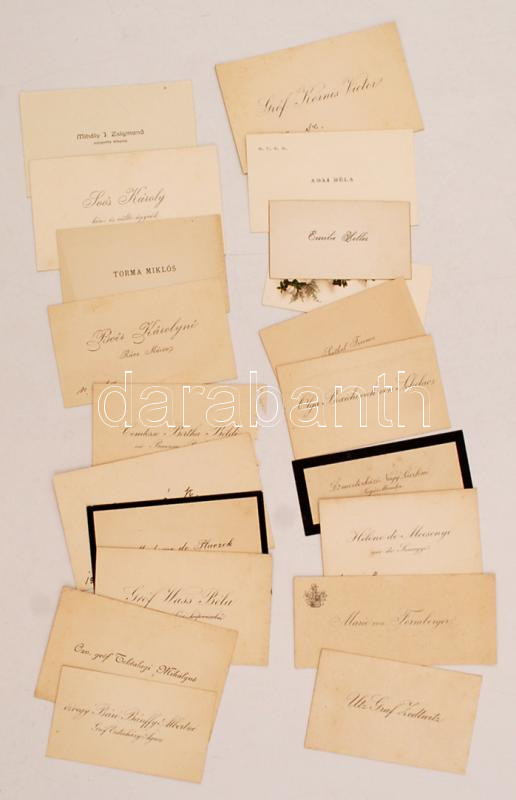 cca 1900 Magyar és külföldi nemesek és főúri méltóságok névjegyei, köztük pl.:Gróf Vass Béla, Özv. gróf Toldafagi Mihályné, gróf Kornis Victor, Gróf Esterházy Ágnes, stb., különböző méretben és minőségeben, 20db
