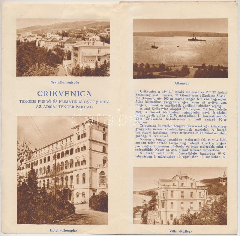 Beschreibung: cca 1930-1940 "Crikvenica, Jugoszlávia legszebb klimatikus fürdőhelye az Adrián", fotükkal illusztrált utazási prospektus
