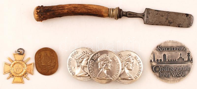Beschreibung: Agancsnyelű kés, Erzsébet királynőt ábrázoló hajcsat, egyéb érmével, kitűzővel