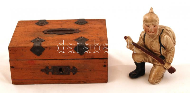 Beschreibung: Katonát mintázó porcelán persely(m: 10 cm) és fa persely, kulcs nélkül, alján aláírással, évszámmal, 12x8x5,5 cm
