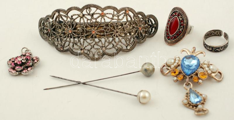 Vegyes bizsu tétel, gyűrűk, kalaptűk, stb. https://www.darabanth.com/de/256-Fernauktion/256.0/Andere-Sammelgebiete/Flohmarkt~10/Vegyes-bizsu-tetel-gyuruk-kalaptuk-stb~II1207740