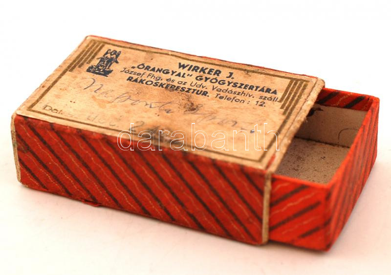 Wirker J. "Őrangyal" Gyógyszertár, Rákoskeresztúr papírdoboz, 3,5x6x2c... https://www.darabanth.com/de/256-Fernauktion/256.0/Andere-Sammelgebiete/Flohmarkt~10/Wirker-J-Orangyal-Gyogyszertar-Rakoskeresztur-papirdoboz-3-5x6x2cm~II1252862