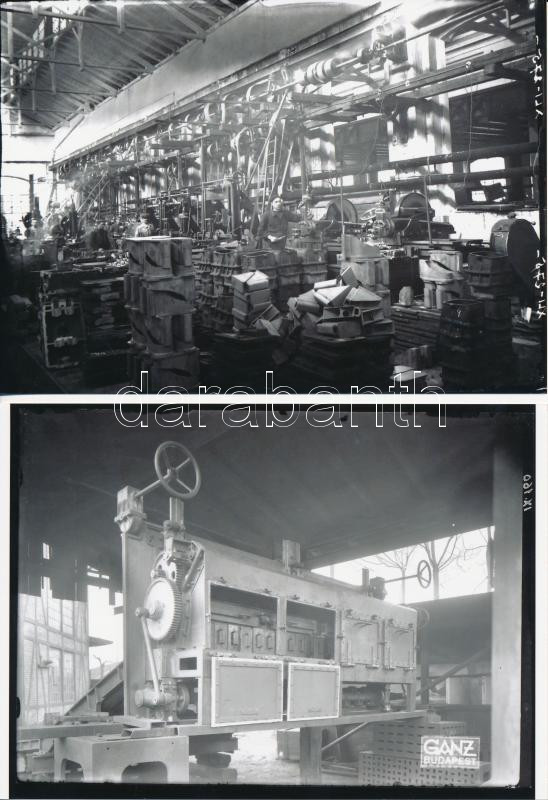 Beschreibung: cca 1930 Budapest, Ganz gyár, üzemcsarnokok, termékek, csoportkép, stb., 9 db korabeli üveglemez negatívról készült modern nagyítás, 13x18 cm