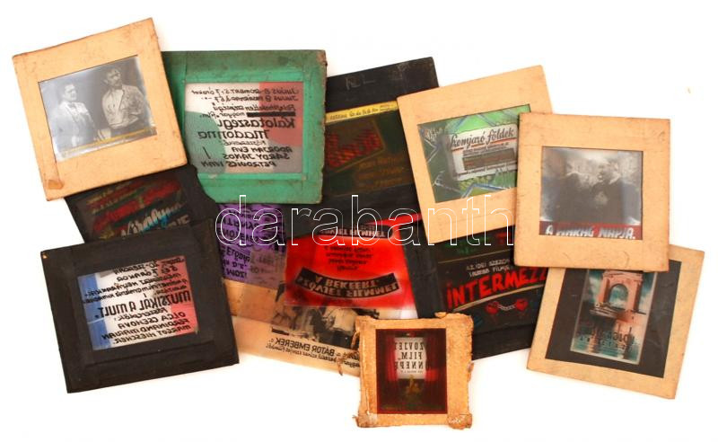 cca 1947 Fekete György (1904-1990) budapesti fényképész specialitása a mozikban nagyfilmek előtt vetített álló diapozitív reklámképek voltak, ez az összeállítás a mozival kapcsolatos reklámokat, tájékoztatókat tartalmazza, 13 db diapozitív kép üveglemezen, néhány színezett, 8x8 cm és 4x6 cm közötti méretben