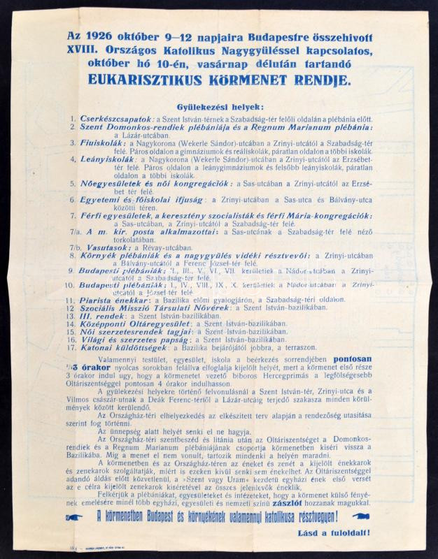 1926 Eucharisztikus körmenet rendje. Szabályzat, hátoldalán térképpel https://www.darabanth.com/de/256-Fernauktion/256.0/Andere-Sammelgebiete/Militaria~24/1926-Eucharisztikus-kormenet-rendje-Szabalyzat-hatoldalan-terkeppel~II1257508