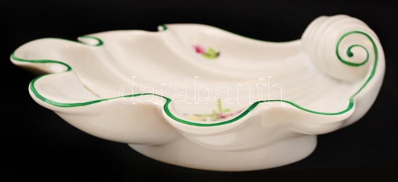 Beschreibung: Kagyló alakú viárgmintás Herendi tál, kézzel festett, jelzett (tertia), apró kopásnyomokkal, 22×23,5 cm