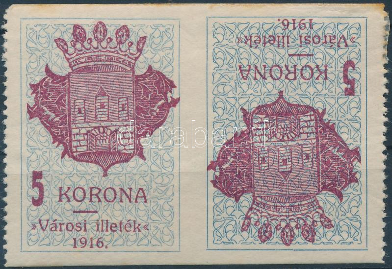 Beschreibung: 1916 Székesfehérvár városi illetékbélyeg 5K középen fogazatlan fordított állású pár (48.000)
