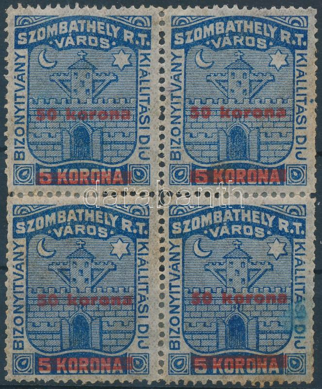 Beschreibung: 1922 Szombathely városi 50/5K 4-es tömb illetékbélyeg (20.000)