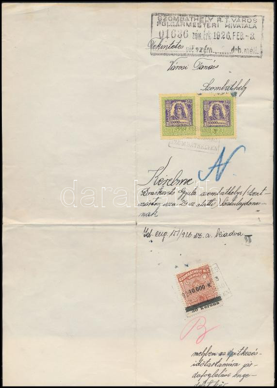 1926 Szombathely városi illetékbélyeg okmányon https://www.darabanth.com/de/256-Fernauktion/256.0/Andere-Sammelgebiete/Stempelmarken~14/1926-Szombathely-varosi-illetekbelyeg-okmanyon~II1252589