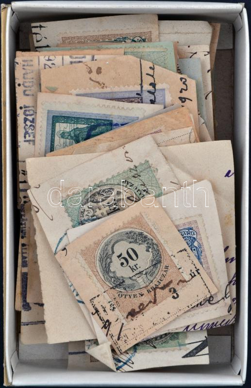 Beschreibung: Több mint 100 klf okmánybélyeg kivágásokon, kis dobozban ömlesztve