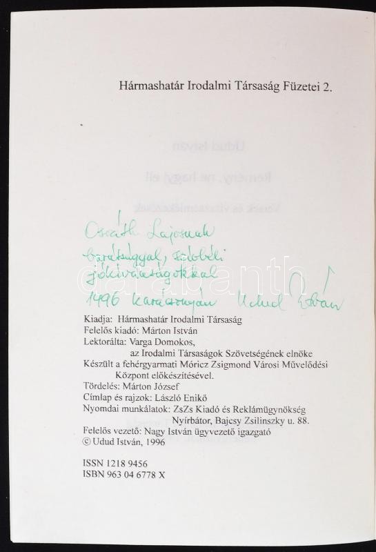 Hármashatár Irodalmi Társaság. 79 p. Kiadói papírkötésben. Dedikált példány!