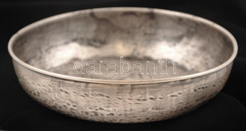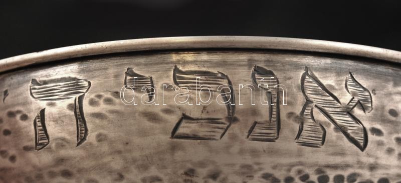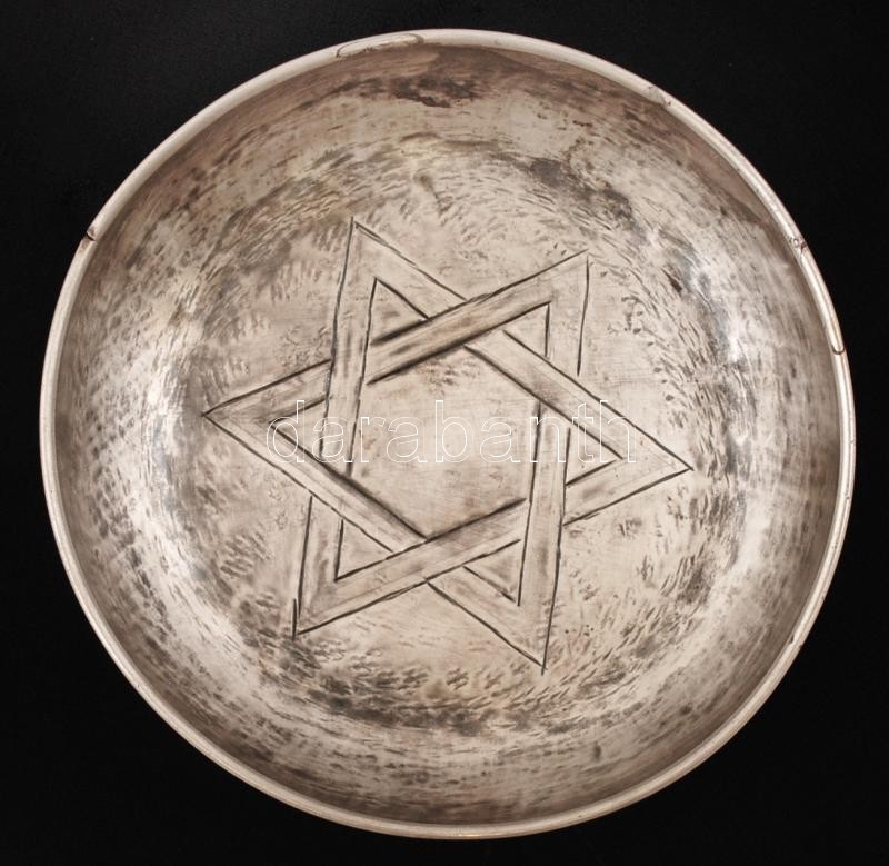 Dávid csillagos ezüst tálka héber felirattal, Ag., 108gr.,jelzés nélkül, kis horpadással, 3,5x15cm/ Star of David Silver Bowl with Hebrew inscription, Ag., 108gr., without hallmark, 3,5x15cm