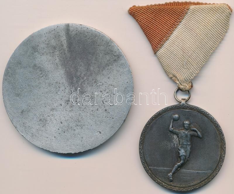 Beschreibung: 1948. "Magyar Kereskedelmi Alkalmazottak Szabad Szakszervezete - Kirakatrendező szakosztály - Munkaverseny 1948" fém sportérem (60mm) + "Vasutas Szakszervezet Sporttitkársága" kézilabda díjérem szalaggal (40mm) T:2-