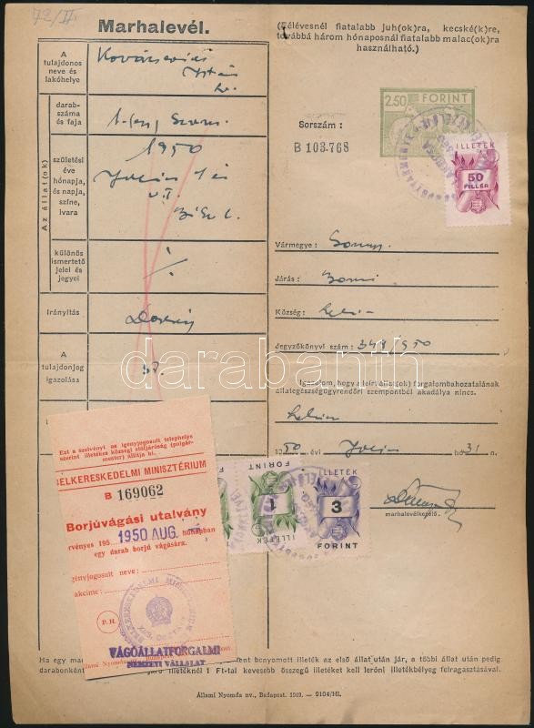 Beschreibung: 1950 Marhalevél, 3db, borjúvágási utalvánnyal ill., állatorvosi igazolvánnal, illetékbélyeggel.