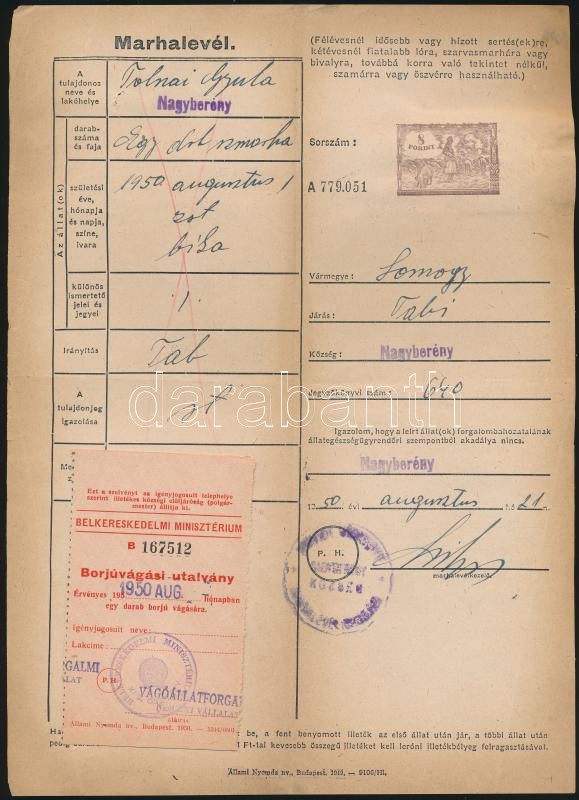 1950 Marhalevél, 3db, borjúvágási utalvánnyal ill., állatorvosi igaz... https://www.darabanth.com/de/257-Fernauktion/257.0/Andere-Sammelgebiete/Dokument~16/1950-Marhalevel--3db-borjuvagasi-utalvannyal-ill-allatorvosi-igazolvannal-illetekbely~II1262435