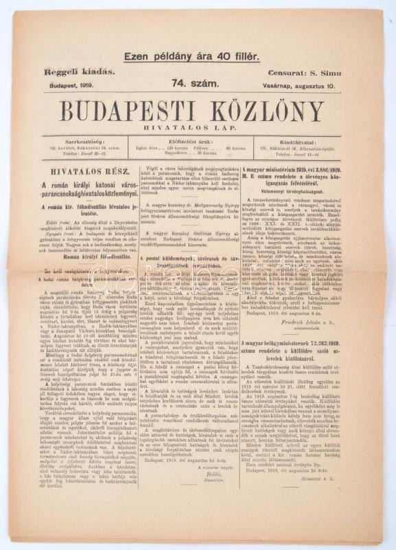 73-74. szám, 1919 augusztus 9. esti és 10. reggeli kiadás. Cenzúrázott kiadások, benne hivatalos közlemények a Tanácsköztársaság bukása utáni szervezeti átalakításokról, illetve a megszálló román csapatok által kiadott utasításokról. Egy MTI tudosítás cenzurális okokból kitakarva.