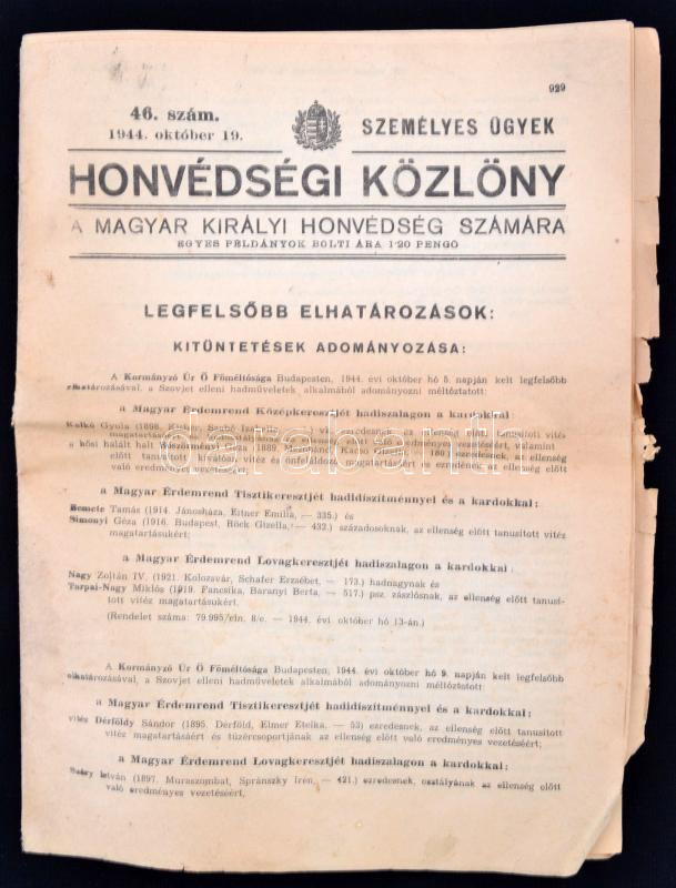 1944 A Honvédségi közlöny október 19-i száma https://www.darabanth.com/de/257-Fernauktion/257.0/Andere-Sammelgebiete/Militaria~26/1944-A-Honvedsegi-kozlony-oktober-19-i-szama~II1262825