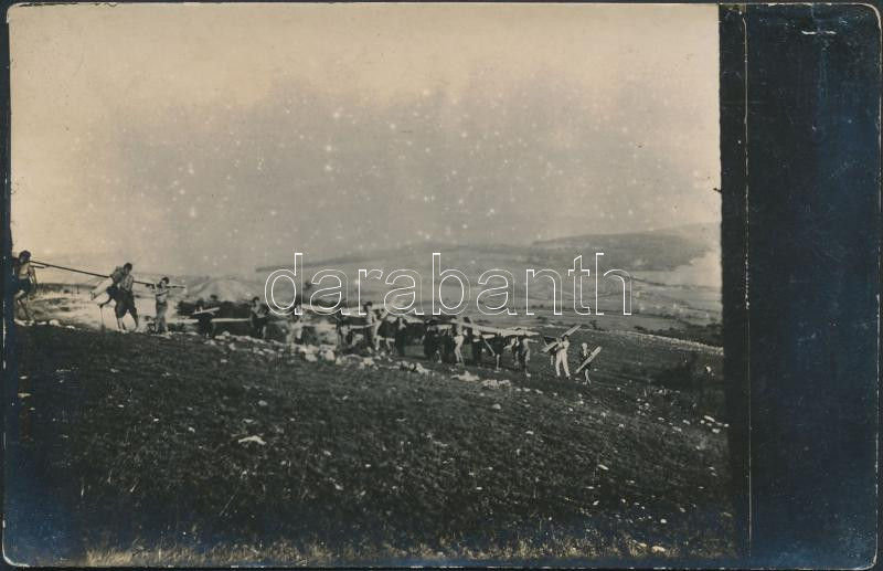 Beschreibung: cca 1930 Cserkészek viszik a sportrepülőket fel a Hármashatárhegyre, fotó, 8x11cm