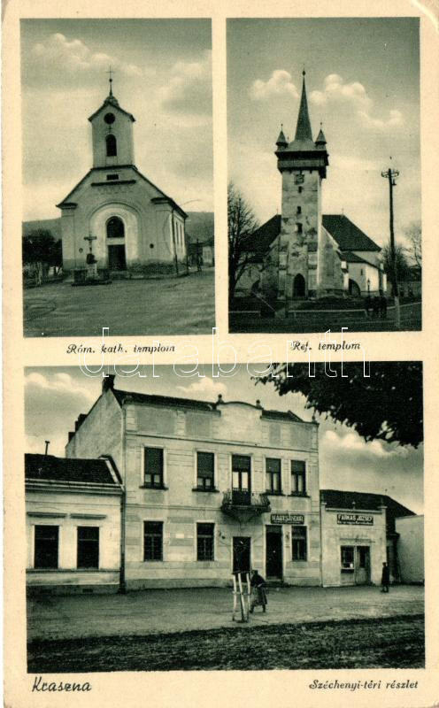Beschreibung: Kraszna, Crasna; Széchenyi tér, Nagy Sándor és Farkas József üzletei, katolikus és református templomok / shops, churches
