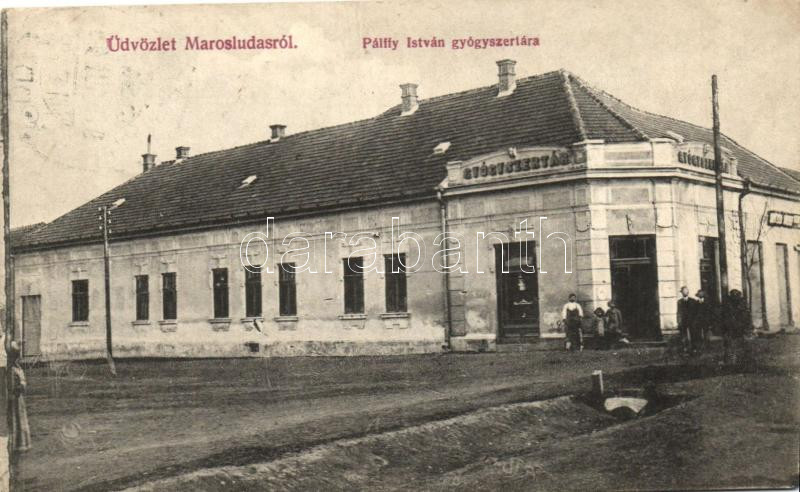 Marosludas, Ludus; Pálffy István gyógyszertára. Szilágyi Arthur műterm... https://www.darabanth.com/de/257-Fernauktion/257.0/Ansichtskarten/Siebenburgen~400009/Marosludas-Ludus-Palffy-Istvan-gyogyszertara-Szilagyi-Arthur-mutermebol-pharmacy~II1262441
