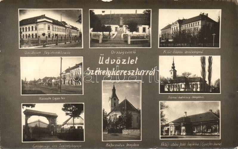 Székelykeresztúr, Cristuru Secuiesc; Unitárius főgimnázium, Országzászló, M. kir. állami tanítóképző, Kossuth Lajos tér, Római katolikus templom, Gazdasági iskola Székelykapuja, Református templom, a Gyárfás kúria Petőfi utolsó földi hajléka; kiadja Nagy fényképész/ unitarian grammar school, national flag, teachers school, square, church, gate, villa, photo (EB)
