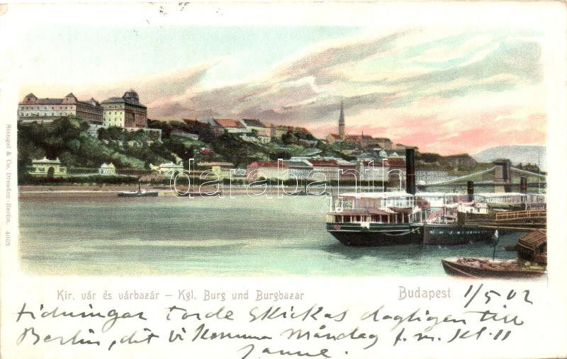 Budapest I. Királyi vár és várbazár, gőzhajók, litho (EK) https://www.darabanth.com/de/257-Fernauktion/257.0/Ansichtskarten/Ungarn~400010/Budapest-I-Kiralyi-var-es-varbazar-gozhajok-litho-EK~II1263946