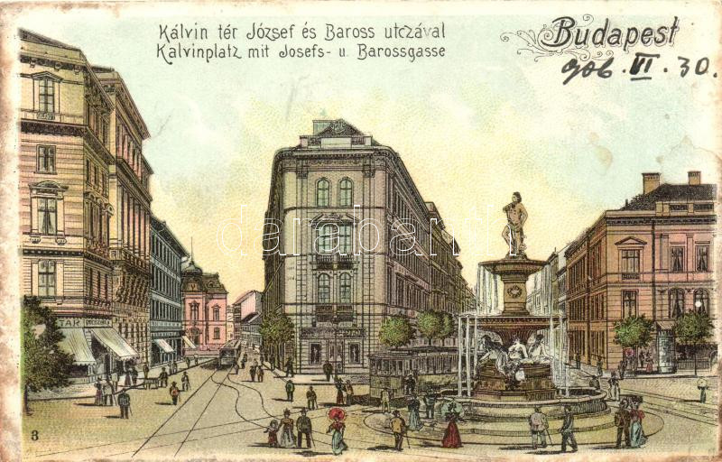 Budapest VIII. Kálvin tér, Baross utca, villamos, szökőkút, litho (EK) https://www.darabanth.com/de/257-Fernauktion/257.0/Ansichtskarten/Ungarn~400010/Budapest-VIII-Kalvin-ter-Baross-utca-villamos-szokokut-litho-EK~II1262943