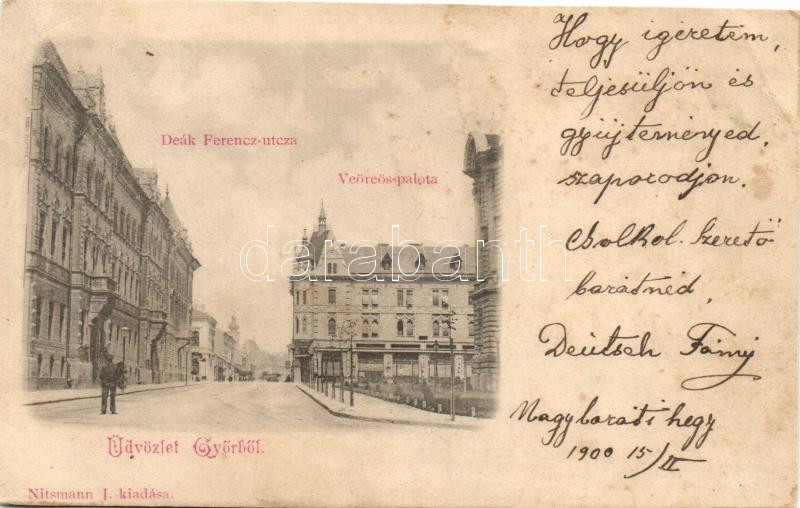 Győr, Deák Ferenc utca, Vörös palota; kiadja Nitsmann J. (vágott / cut... https://www.darabanth.com/de/257-Fernauktion/257.0/Ansichtskarten/Ungarn~400010/Gyor-Deak-Ferenc-utca-Voros-palota-kiadja-Nitsmann-J-vagott-cut~II1260782
