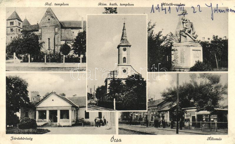 Ócsa, vasútállomás, Református templom, Római Katolikus templom, Hősök... https://www.darabanth.com/de/257-Fernauktion/257.0/Ansichtskarten/Ungarn~400010/Ocsa-vasutallomas-Reformatus-templom-Romai-Katolikus-templom-Hosok-szobra-Jarasbiro~II1258914