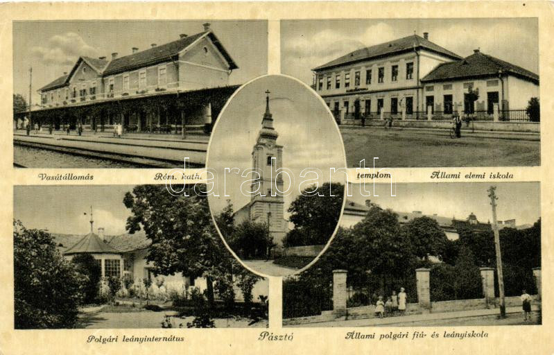 Pásztó, vasútállomás, Állami elemi iskola, Polgári leányinternátus, Po... https://www.darabanth.com/de/257-Fernauktion/257.0/Ansichtskarten/Ungarn~400010/Paszto-vasutallomas-Allami-elemi-iskola-Polgari-leanyinternatus-Polgari-fiu-es-lean~II1258879