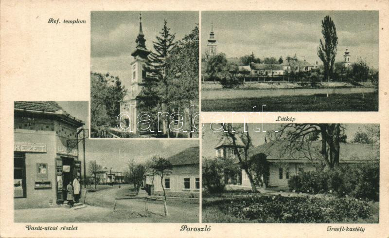 Beschreibung: Poroszló, Vas utcai részlet a Hangya Szövetkezet üzletével, Graefl-kastély, Református templom, kiadja a Hangya Szövetkezet