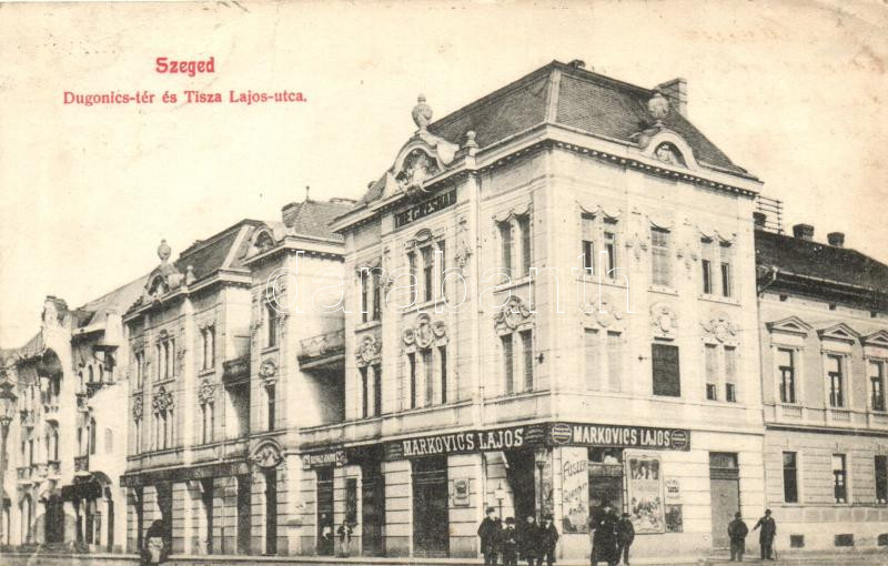 Beschreibung: Szeged, Dugonics tér és Tisza Lajos utca, Markovics Lajos fűszerkereskedése (fa)