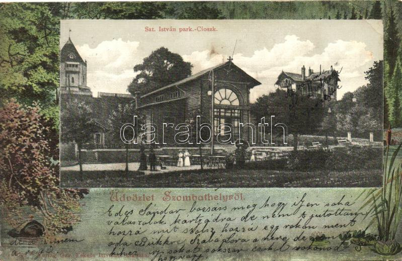 Beschreibung: Szombathely, Szent István park kioszk, erdő, kiadja Özv. Fekete Istvánné (EB)