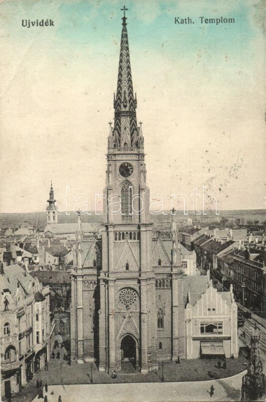 Beschreibung: Újvidék, Novi Sad; Katolikus templom, Moskovits Anatómiai Cipőgyár / Catholic church, shoe shop (EB)